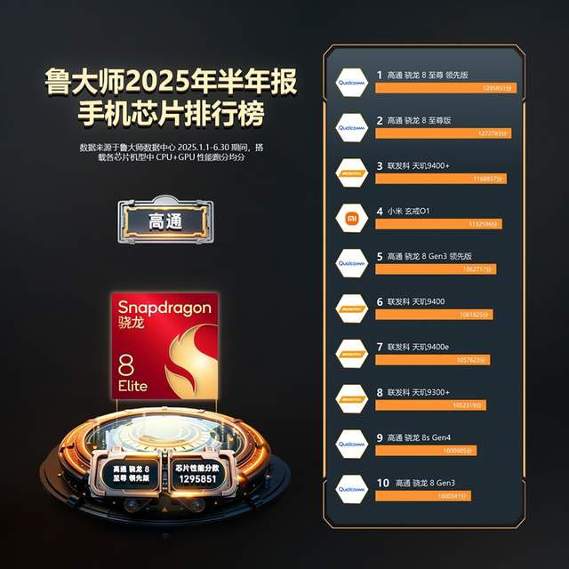从具体的表现来看,这颗芯片还是很强的,在上半年的时候,这颗芯片性能是排在第四名的,仅次于联发科的天玑9400+,超过了高通骁龙8Gen3领先版。